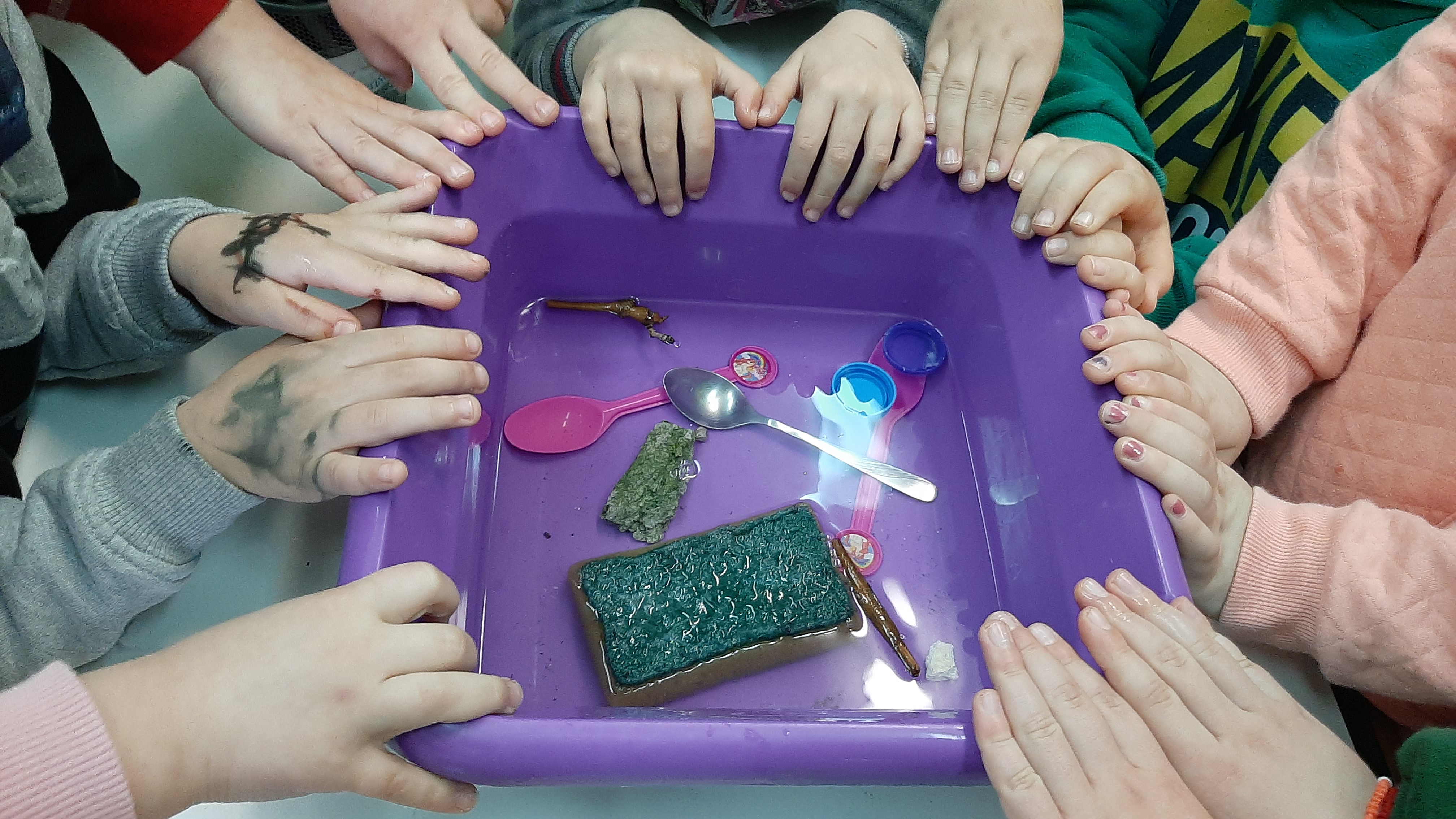 Σέ αυτό το μάθημα οι μαθητές διερεύνησαν με βιωματικό τρόπο αντικείμενα που βυθίζονται-επιπλέουν στο νερό. Τα υλικά μας ήταν: λεκάνη με νερό, πλαστικό-σιδερένιο κουτάλι, καπάκια, ξυλάκι, πέτρα, σφουγγάρι.